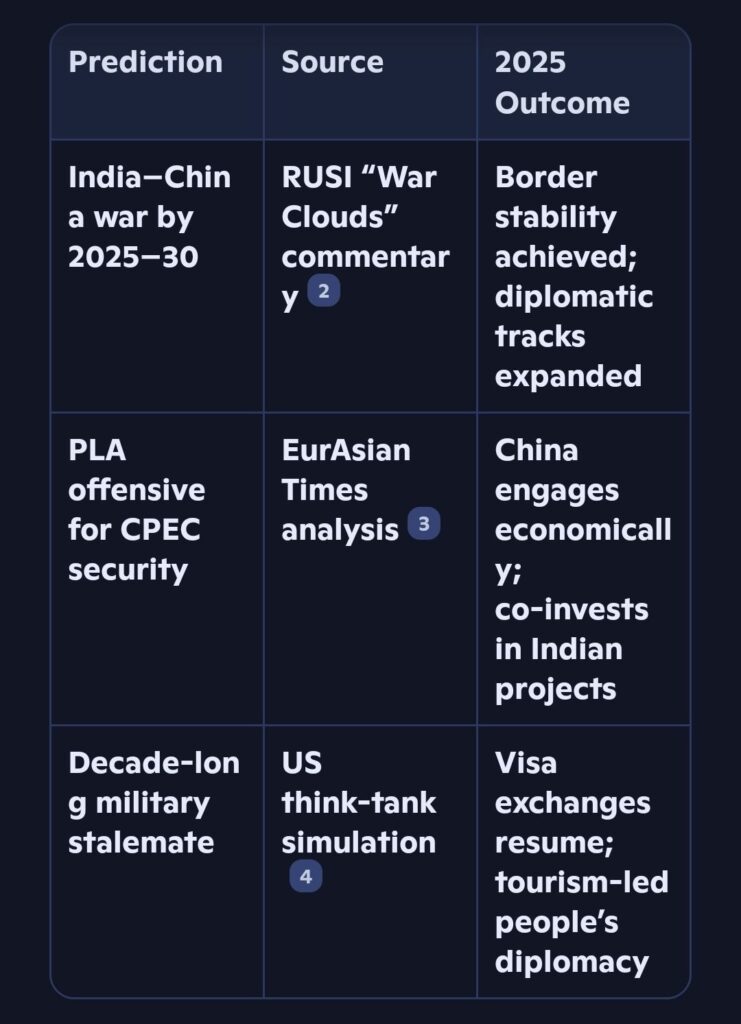 – RUSI’s “War Clouds” Forecast (2024): Samir Tata warned of a likely India–China conflict in Eastern Ladakh between 2025 and 2030, driven by China’s energy-security concerns around CPEC and skewed power dynamics.